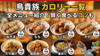 外食カロリー 【2026年最新】鳥貴族の全メニューカロリー一覧!低い順ランキングも公開 鳥貴族の全メニュー(焼き鳥・一品料理・ドリンク)のカロリーを一覧表で網羅!最新の数値に基づき、ダイエット中におすすめの低カロリーメニューをランキング形式で紹介します。 2026.04.02 外食カロリー