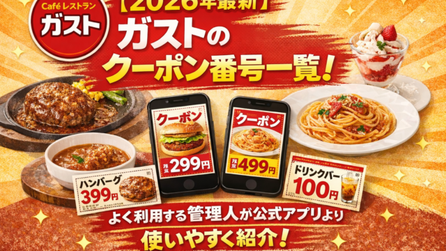 クーポン 【2026年2月最新】ガストのクーポン番号一覧!よく利用する管理人が公式アプリより使いやすく紹介! ガストのクーポン番号を見やすく紹介します!クーポンでお得にガストを楽しみましょう! 2026.02.22 クーポン