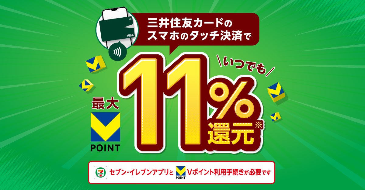 セブン-イレブンでVポイントいつでも最大11%還元!!三井住友カードのスマホのタッチ決済で、Vポイントがいつでも最大11%貯まります。