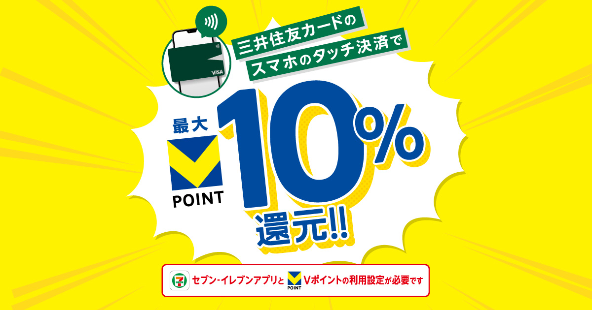 セブン-イレブンでVポイントいつでも最大10%還元!!三井住友カードのスマホのタッチ決済で、Vポイントがいつでも最大10%貯まります。