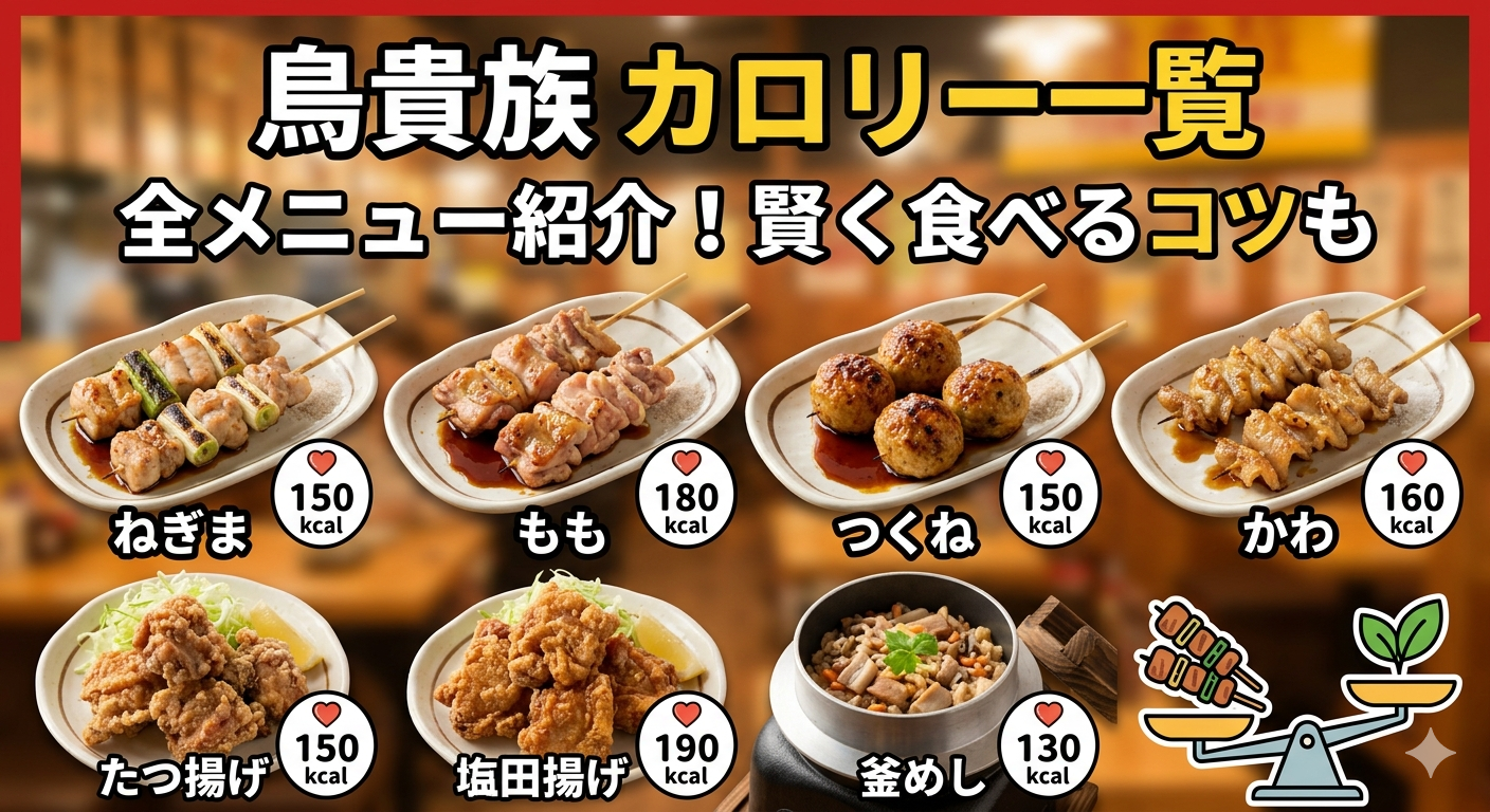 免責事項:本記事のカロリー数値は2026年2月1日時点の鳥貴族公式アレルギー・栄養成分情報に基づいています。メニューは随時更新されるため、最新情報は鳥貴族公式サイトでご確認ください。数量限定メニューについては販売終了している場合があります。
