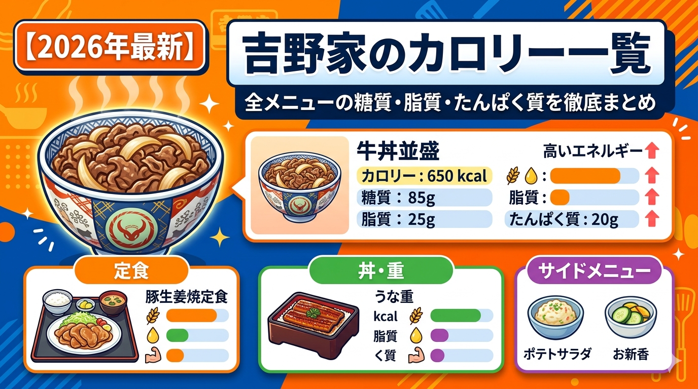 吉野家のカロリー一覧|全メニューの糖質・脂質・たんぱく質を徹底まとめ【2026年最新】